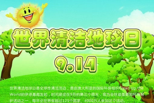 世界清潔地球日又名世界清潔日,英文為Clean Up the World Weekend (CUW Weekend),是全球性清潔活動,是由澳大利亞的國際環(huán)保組織Clean Up the World的伊恩基南發(fā)起,時間是定在9月的第三個周末,現(xiàn)為全球非常重要的環(huán)境保護活動之一,每年全世界有超過125個國家、4000萬人參加這個活動。2006年的世界清潔日活動時間為9月15日至17日3天。也有參與組織和個人把每年的9月14日作為活動時間。