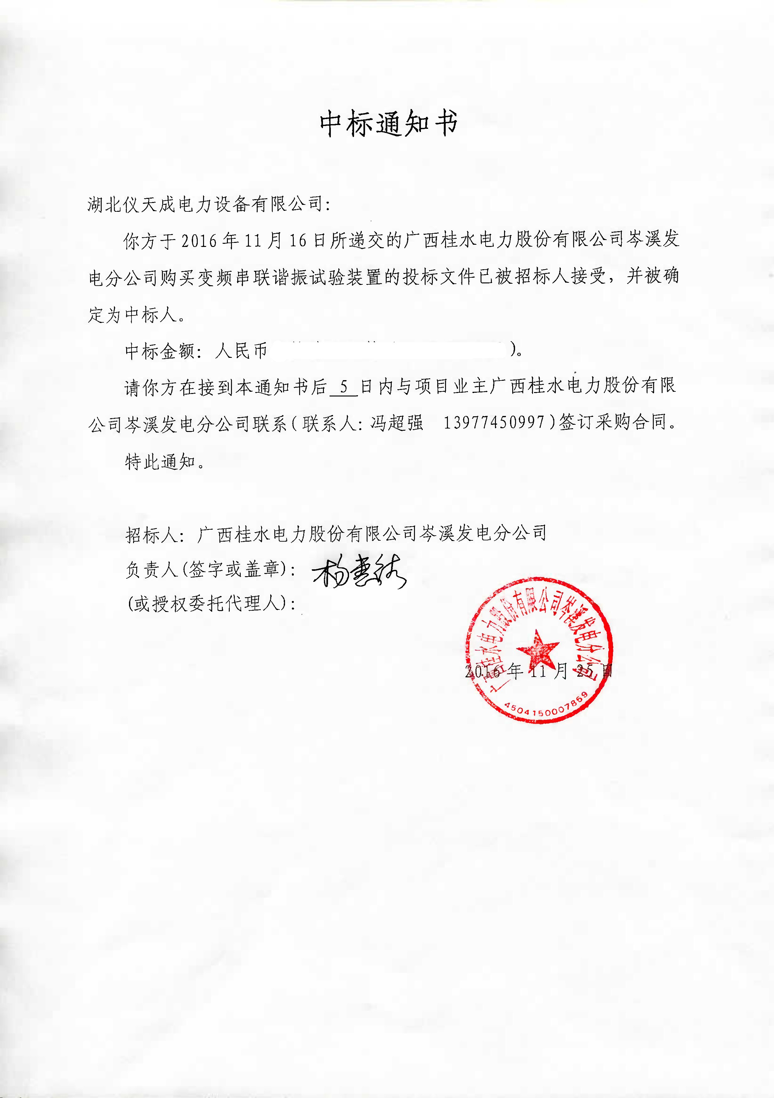 2016年12月,距離2016年結束不到30天的時間,湖北儀天成銷售部傳來好消息:我公司在廣西桂水電力股份有限公司岑溪發電分公司的設備采購招標中,從眾多供應商中脫穎而出,再次中標!