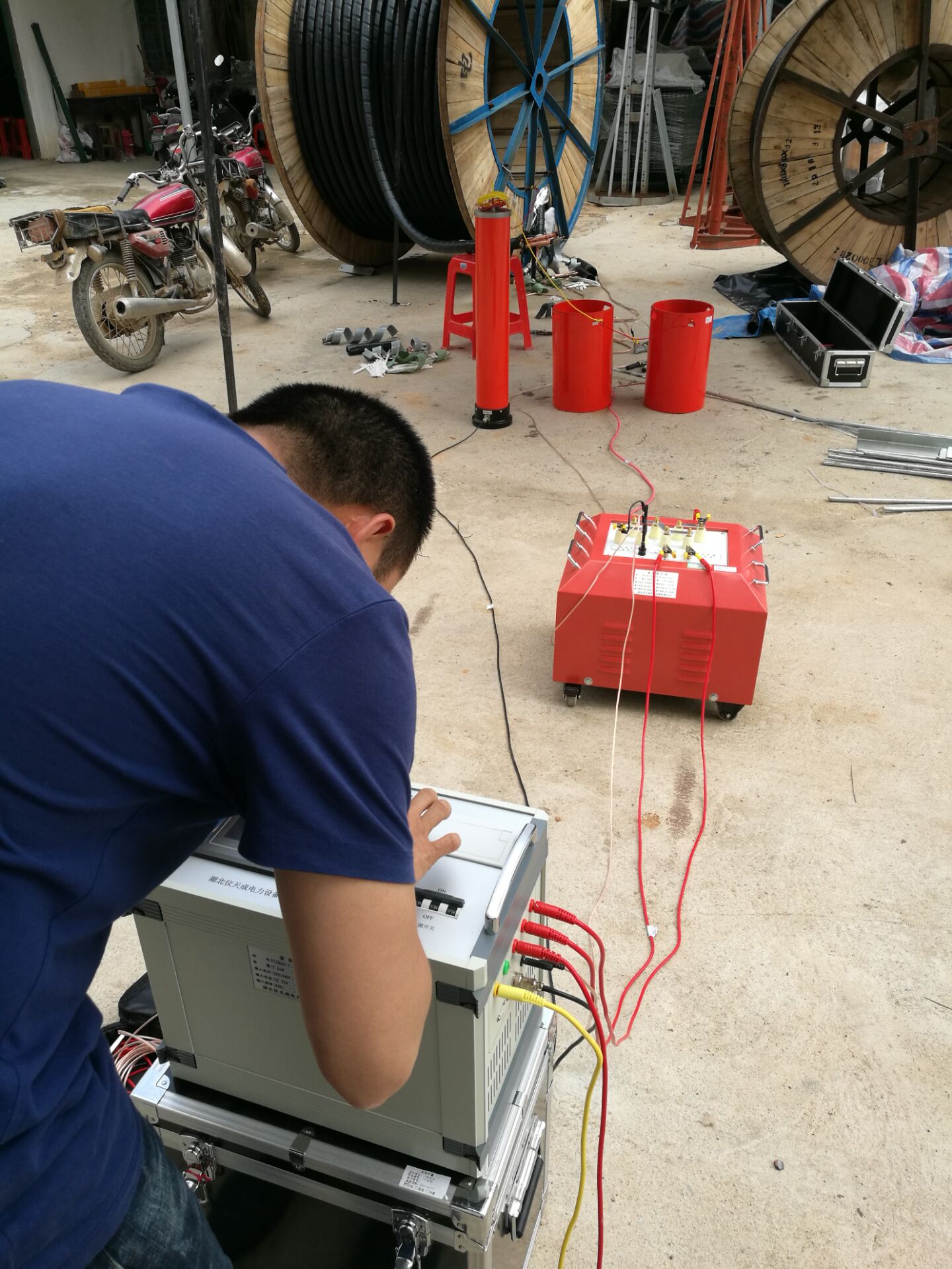 此次培訓的主要設備是YTC850-135kVA/108kV變頻串聯諧振試驗裝置,該裝置主要針對10kV、35kV電纜,35kV及以下電壓等級開關的交流耐壓試驗設計制造。具有較寬的適用范圍,是地、市、縣級高壓試驗部門及電力安裝、修試工程單位理想的耐壓設備。該裝置主要由變頻電源、勵磁變壓器、電抗器、電容分壓器組成。