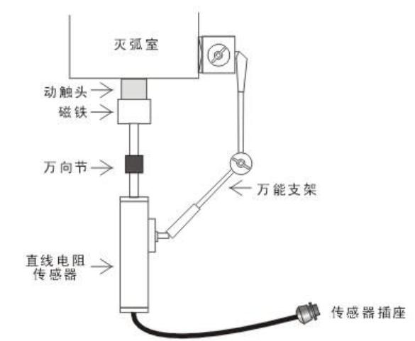 200mm、300mm用于SF6開關行程,速度的測量,此兩種傳感器為非標準配置。以某型號真空開關為例,如下圖。直線電阻傳感器在安裝時,要保證傳感器運動軸能夠直線運動,用磁性萬能支架固定好傳感器。對于SF6開關、油開關,方法類似。