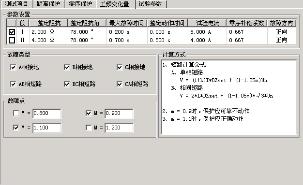 本模塊允許同時(shí)校驗(yàn)兩段定值,并且一次性模擬所有故障類型。試驗(yàn)時(shí),只需要勾選需要測(cè)試的項(xiàng)目,然后按定值單將各種定值參數(shù)依次進(jìn)行設(shè)置即可。M的值默認(rèn)情況下有0.9和1.1兩種設(shè)置,一般地,M=0.9時(shí),保護(hù)應(yīng)可靠不動(dòng)作,M=1.1時(shí),保護(hù)應(yīng)可靠動(dòng)作。設(shè)置M=1.2時(shí),可以測(cè)出保護(hù)的動(dòng)作時(shí)間。“短路電流”參數(shù)應(yīng)設(shè)置得大一些,建議10~20A,因?yàn)槎搪冯娏魈。鶕?jù)上述公式計(jì)算出來(lái)的電壓可能為負(fù)值。試驗(yàn)時(shí),“距離保護(hù)”壓板應(yīng)投入。
