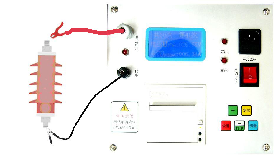 接線:將避雷器放在絕緣性能良好的支架上,然后將測試儀的高壓輸出端接到避雷器的一端,接地端接到避雷器的另一端