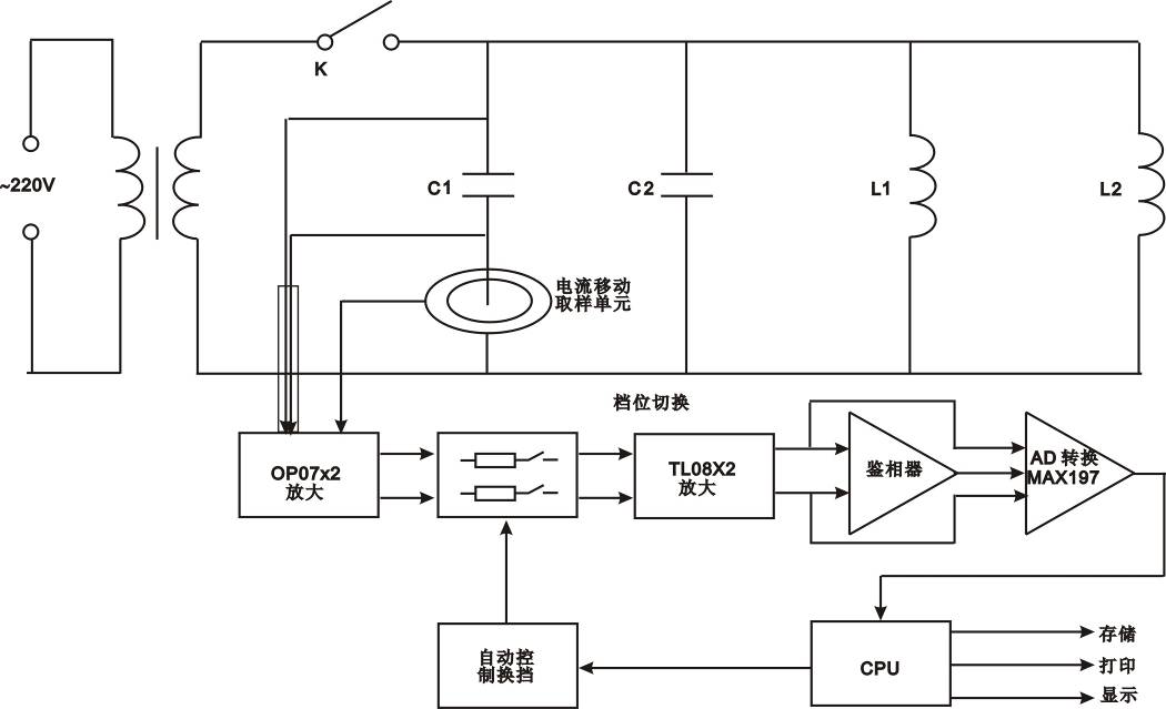 在被測電容支路有對被測電容的電壓、電流取樣的取樣電路,取樣電路的輸出端分別接放大電路,從電壓放大電路輸出的電壓信號和從電流放大電路輸出的電流信號通過鑒相器輸出相位差信號,與電壓信號和電流信號通過A/D轉(zhuǎn)換器后,輸入CPU計算而得到被測電容值。因為采用了移動的電流取樣單元,而使得無需拆除連接線就可以直接測量電容值。