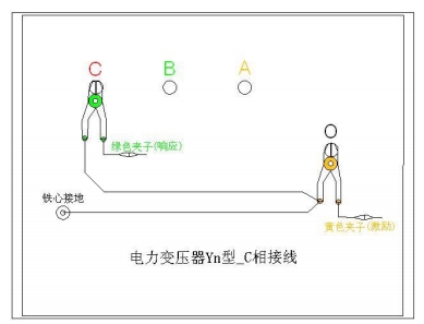 C相測量接線:1. 測 量 系 統(tǒng) 共 一 點 接地,取變壓器鐵芯接地。2. 黃夾子定義為輸入,鉗在 Yn 的‘O’點、綠夾子定義為測量,鉗在 C 相上。3. 地線連接網(wǎng)依次由綠夾子地線孔插入接地線至黃夾子地線孔,再連接一接地線到鐵芯接地。