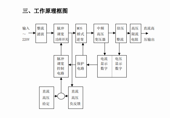 首先,直流高壓發生器接入 220V 或 380V 的交流電源,交流電源通過電源輸入模塊進入設備內部。接著,交流電流流入整流電路,整流電路一般由整流二極管或整流橋堆構成。以常見的橋式整流電路為例,它利用二極管的單向導電性,在交流電源的正半周和負半周分別讓不同的二極管導通,將正弦交流電轉換為脈動直流電。