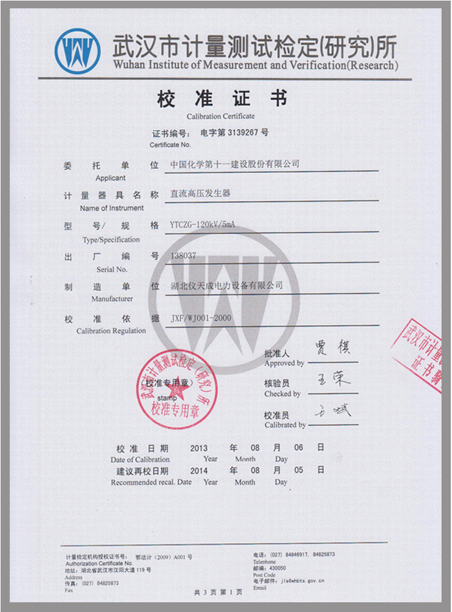 轉載:"YTCZG-120kV/2mA直流高壓發生器鑒定證書" 請注明來源于儀天成電力。 更多技術問題請致電儀天成電力客戶服務:027-87876585,技術部專線:027-87876585,在線客服:719388481