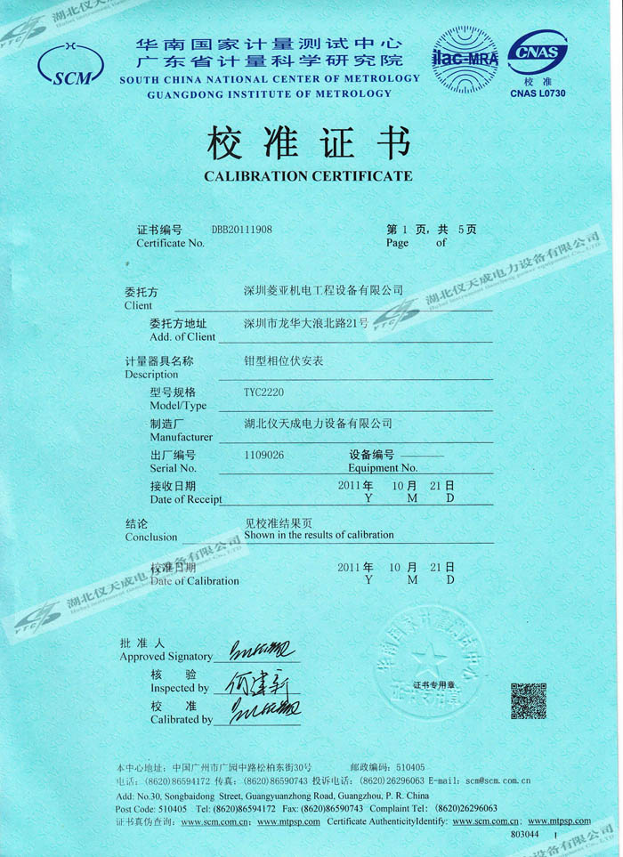 轉(zhuǎn)載:"YTC2220鉗型相位伏安表的資質(zhì)證書" 請(qǐng)注明來源于儀天成電力。 更多技術(shù)問題請(qǐng)致電儀天成電力客戶服務(wù):027-87876585,技術(shù)部專線:027-87876585,在線客服:719388481