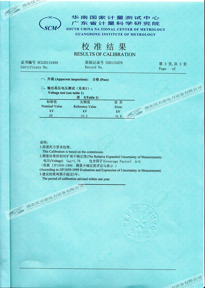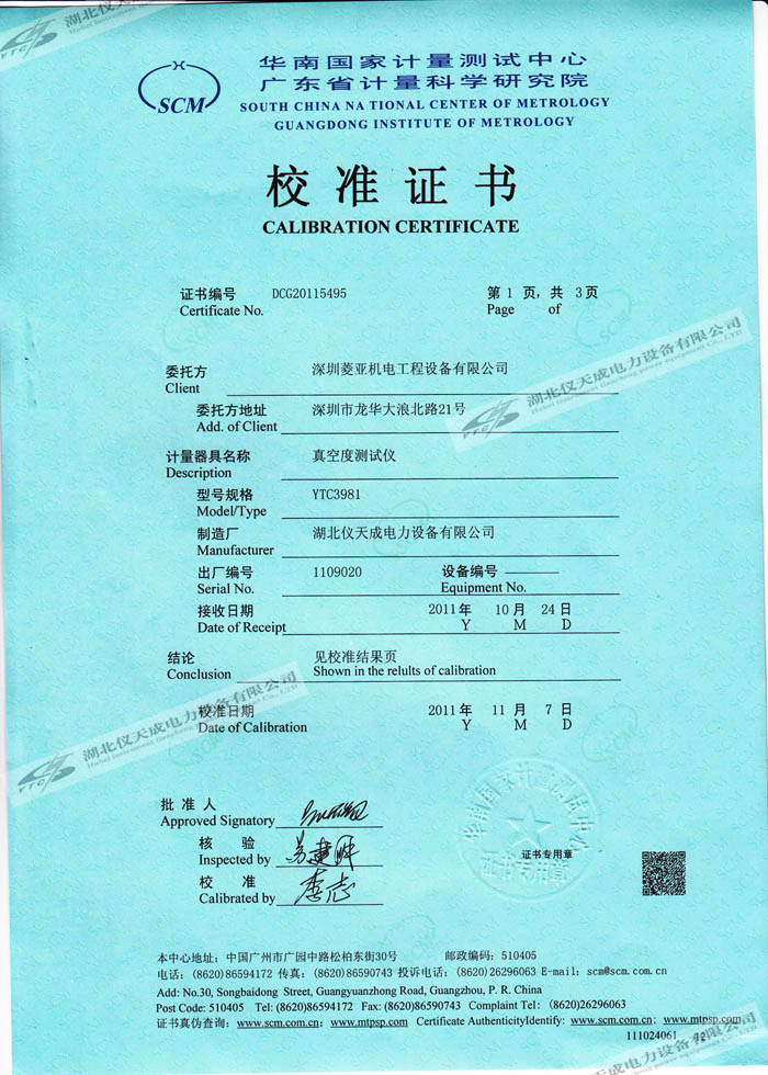 轉載:"YTC3981真空度測試儀的資質證書" 請注明來源于儀天成電力。 更多技術問題請致電儀天成電力客戶服務:027-87876585,技術部專線:027-87876585,在線客服:719388481