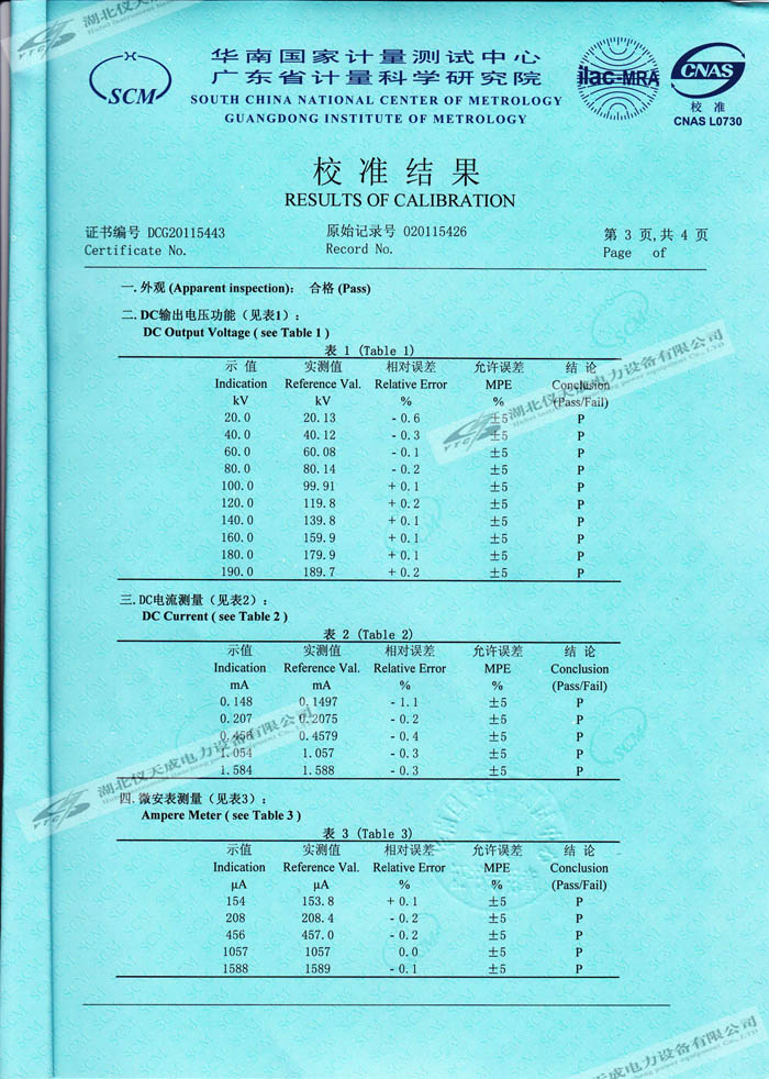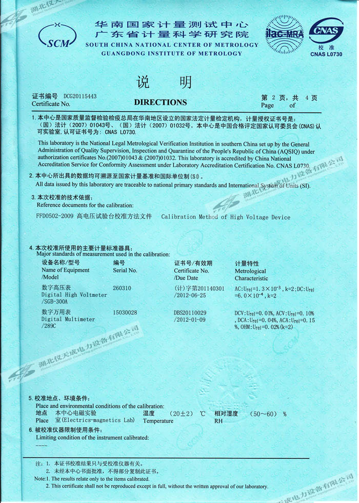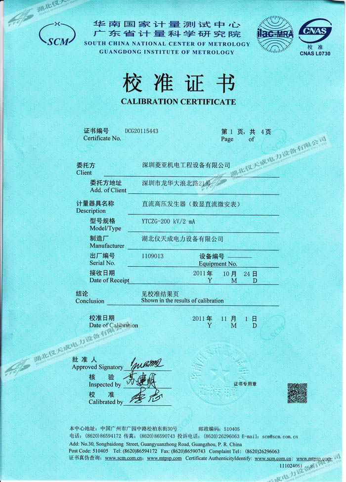 轉載:"YTCZG-200kV2mA直流高壓發生器的資質證書" 請注明來源于儀天成電力。 更多技術問題請致電儀天成電力客戶服務:027-87876585,技術部專線:027-87876585,在線客服:719388481